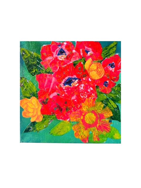 Mixed media collage with hand-painted paper on gallery wrapped canvas. Layered textures with vibrant hues.