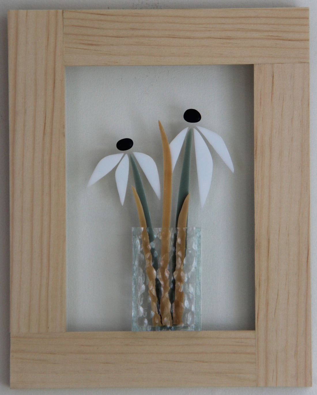 Stained glass in a pine frame.