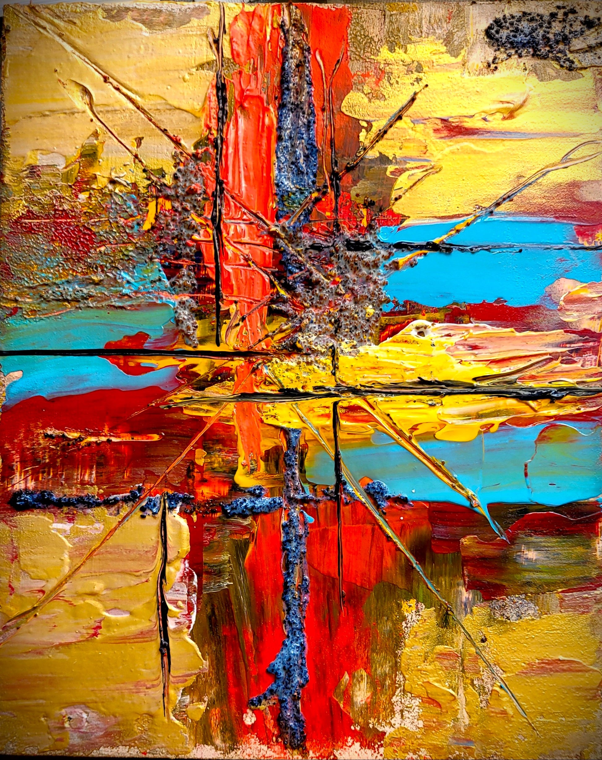 Acrylics (Tri-Art), copper cinder and shredded walnut shells (Tri-Art) on Apollon Birchwood panel.