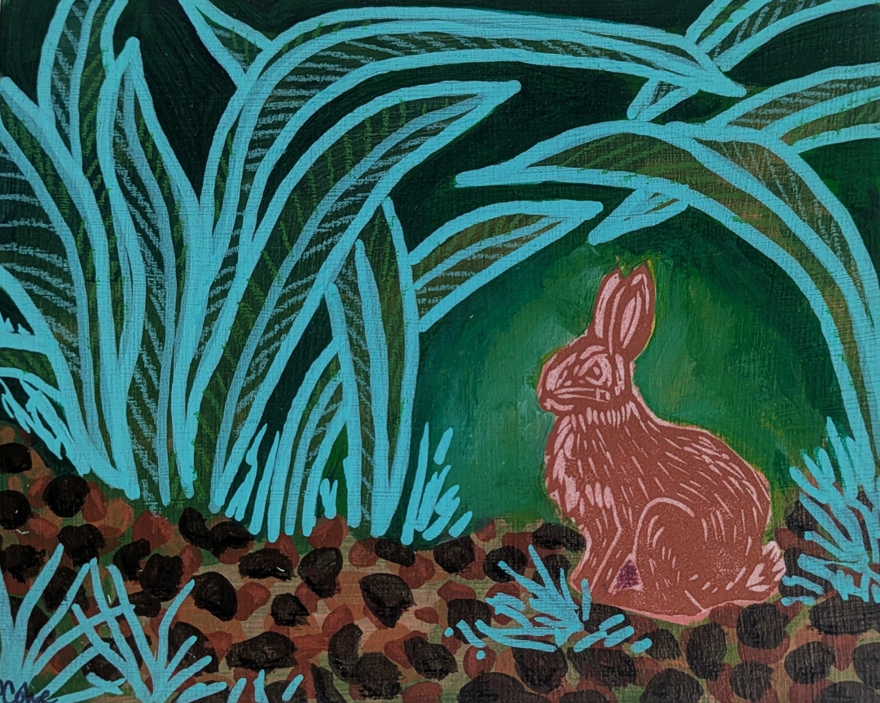 A relief printed rabbit hides among the grasses deep in the garden.