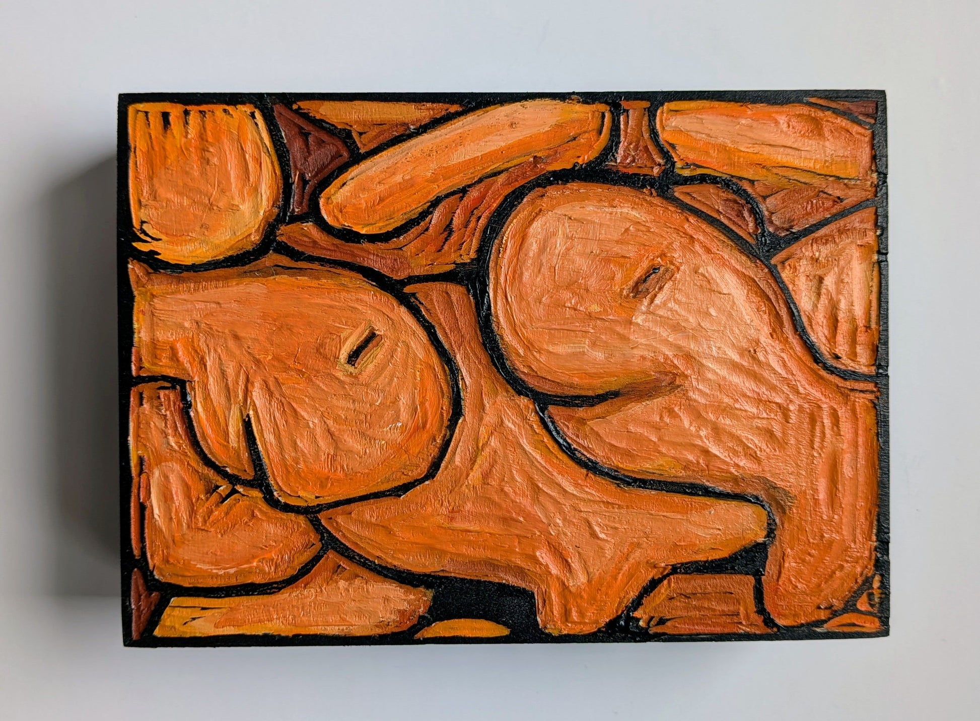 Acrylic on hand carved wooden gallery style panel, with edges painted black and a saw-tooth hanger on the back.