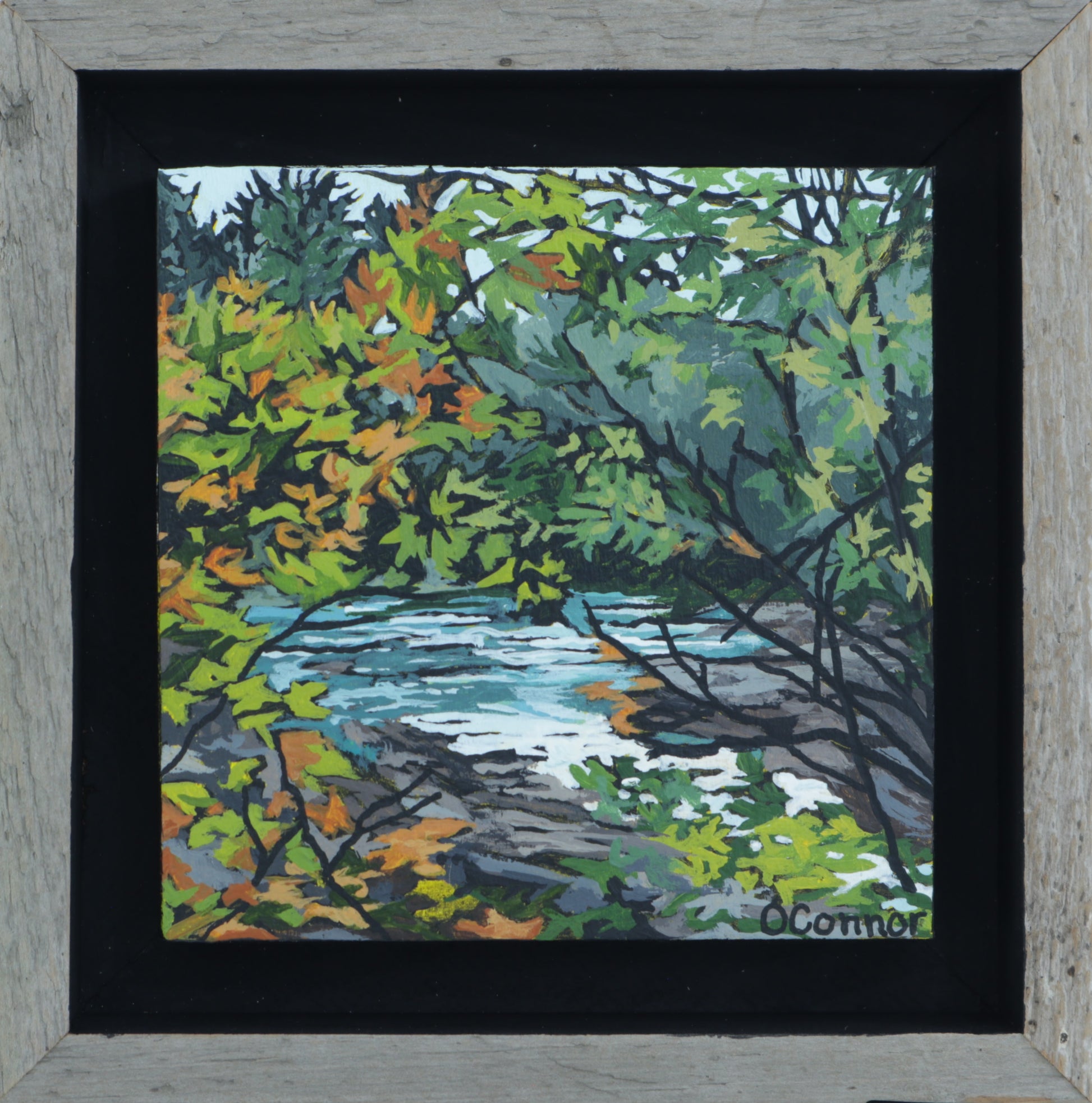 4x4 inch, framed in a reclaimed wood shadow frame; overall dimensions 5 3/4 x 5 3/4 in
