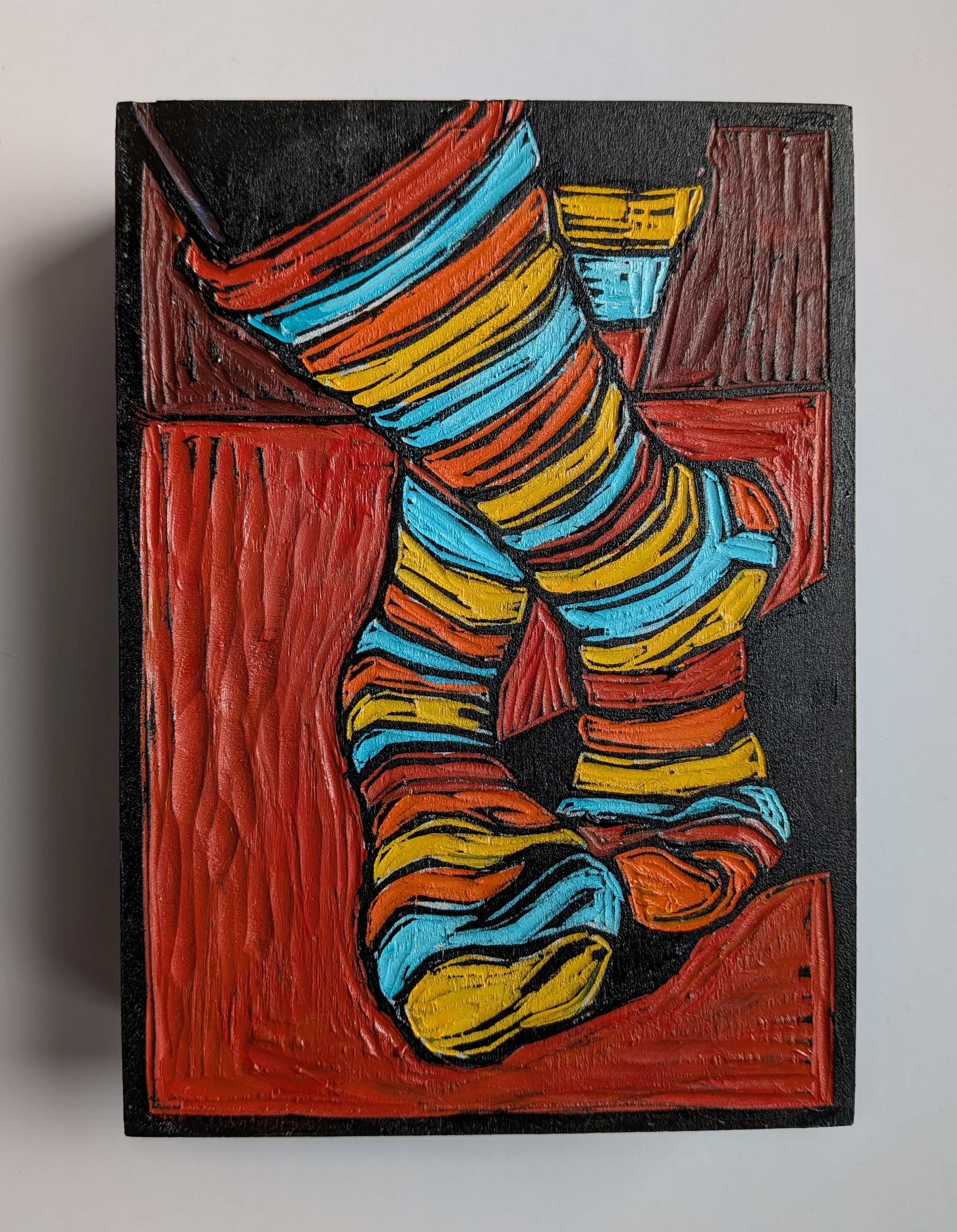 Acrylic on hand carved wooden gallery style panel, with edges painted black and a saw-tooth hanger on the back.
