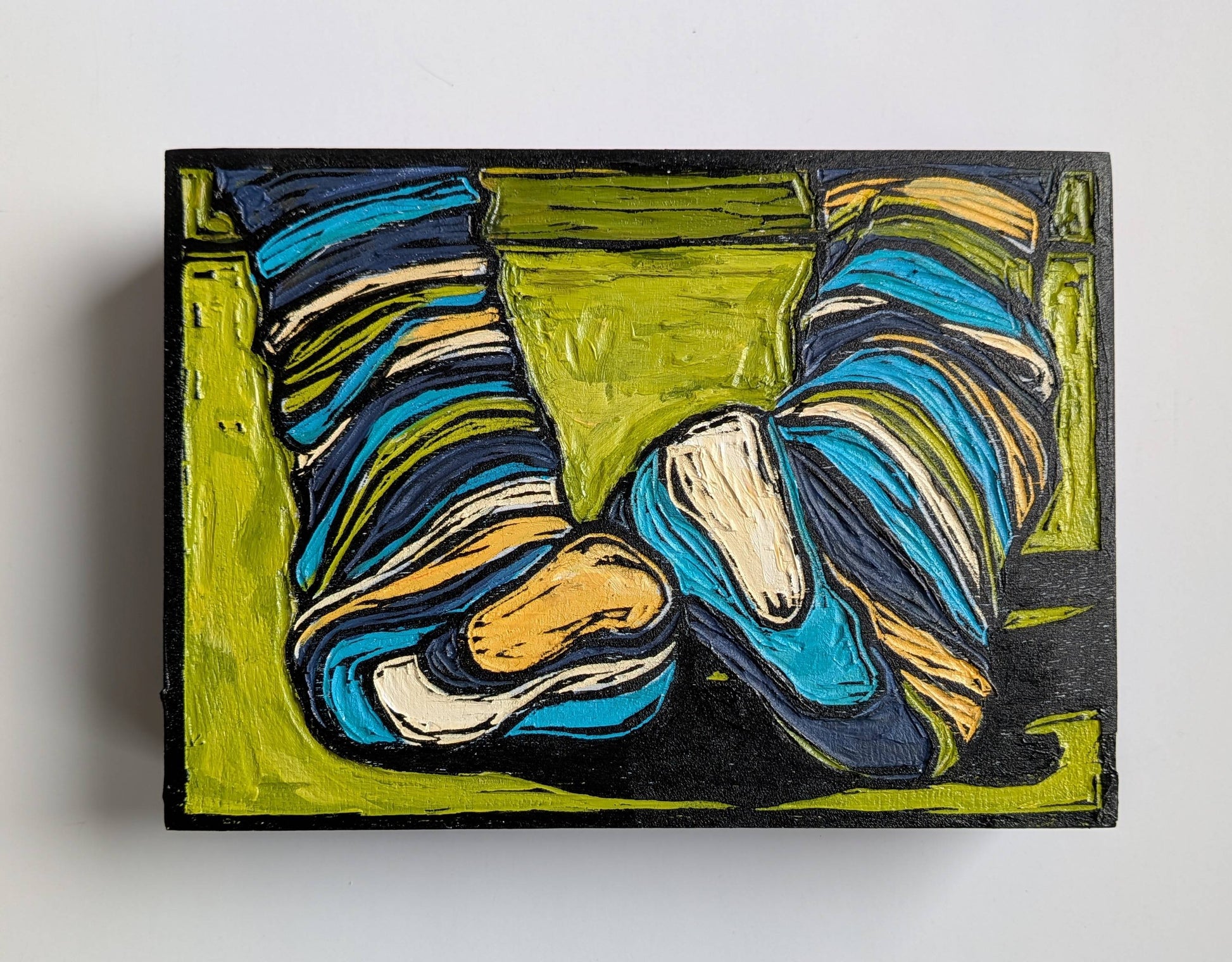 Acrylic on hand carved wooden gallery style panel, with edges painted black and a saw-tooth hanger on the back.