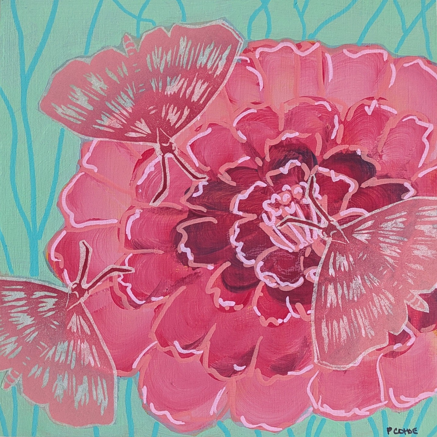 Relief printed moths gather together on a painted pink zinnia.