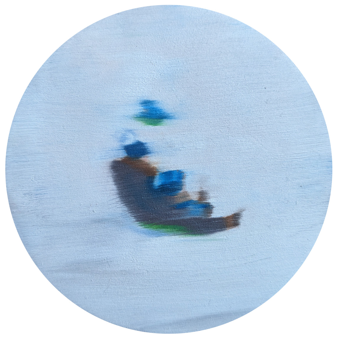 This sweet mini captures a mother and child tobogganing. Painted on wood tondo and ready to hang.