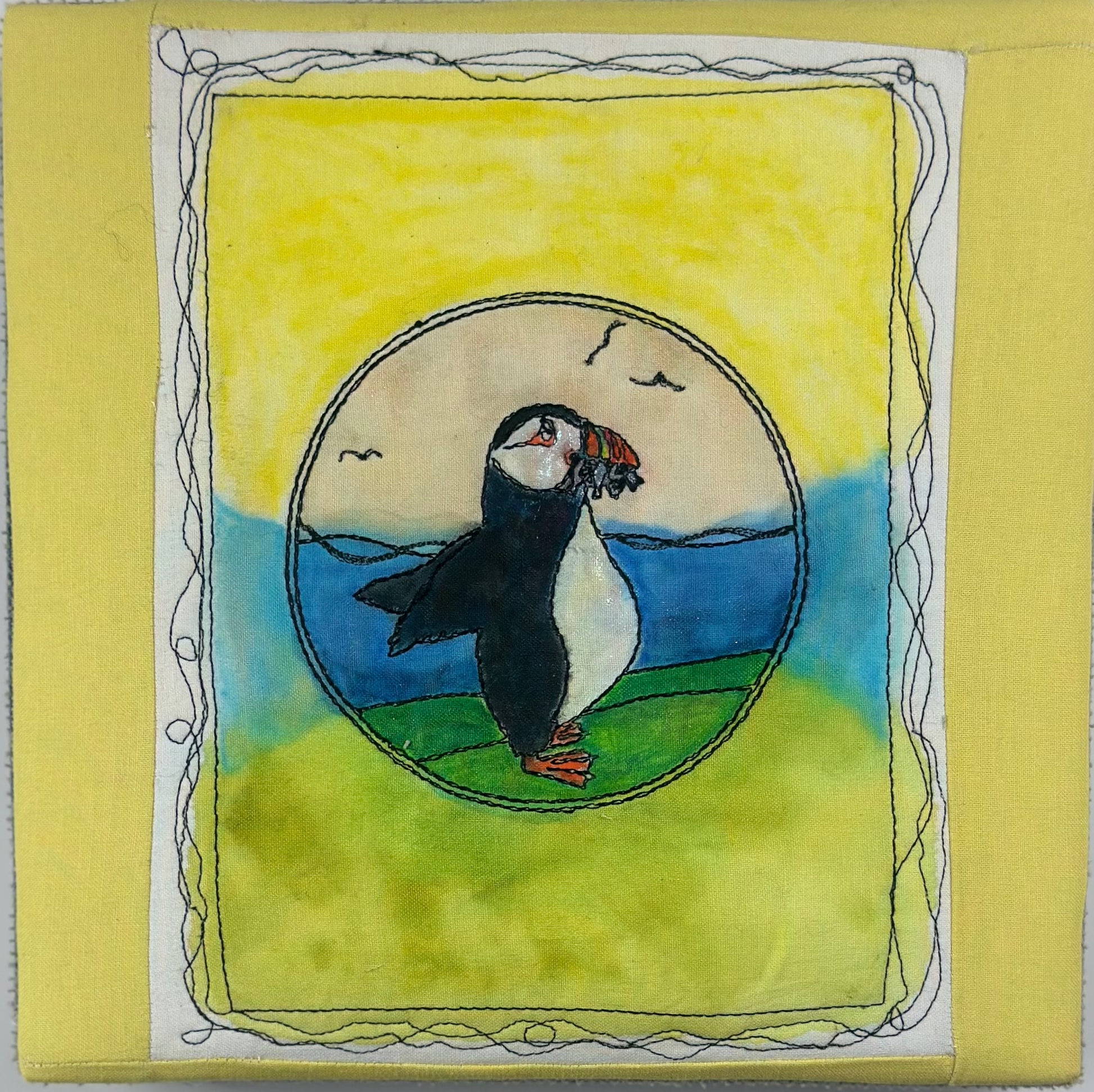 I love Puffins! Hence, I created a series for this show. I have five puffin images created three different mixes of mediums. Totalling 15 unique pieces of Art! Out for a Puff - Embroidery This digitized then embroidery set image, then embellished with more stitching, was painted with dyes on cotton, then quilted together with my hand dyed fabrics! Then it is finished on a gallery depth birch panel, ready to hang!