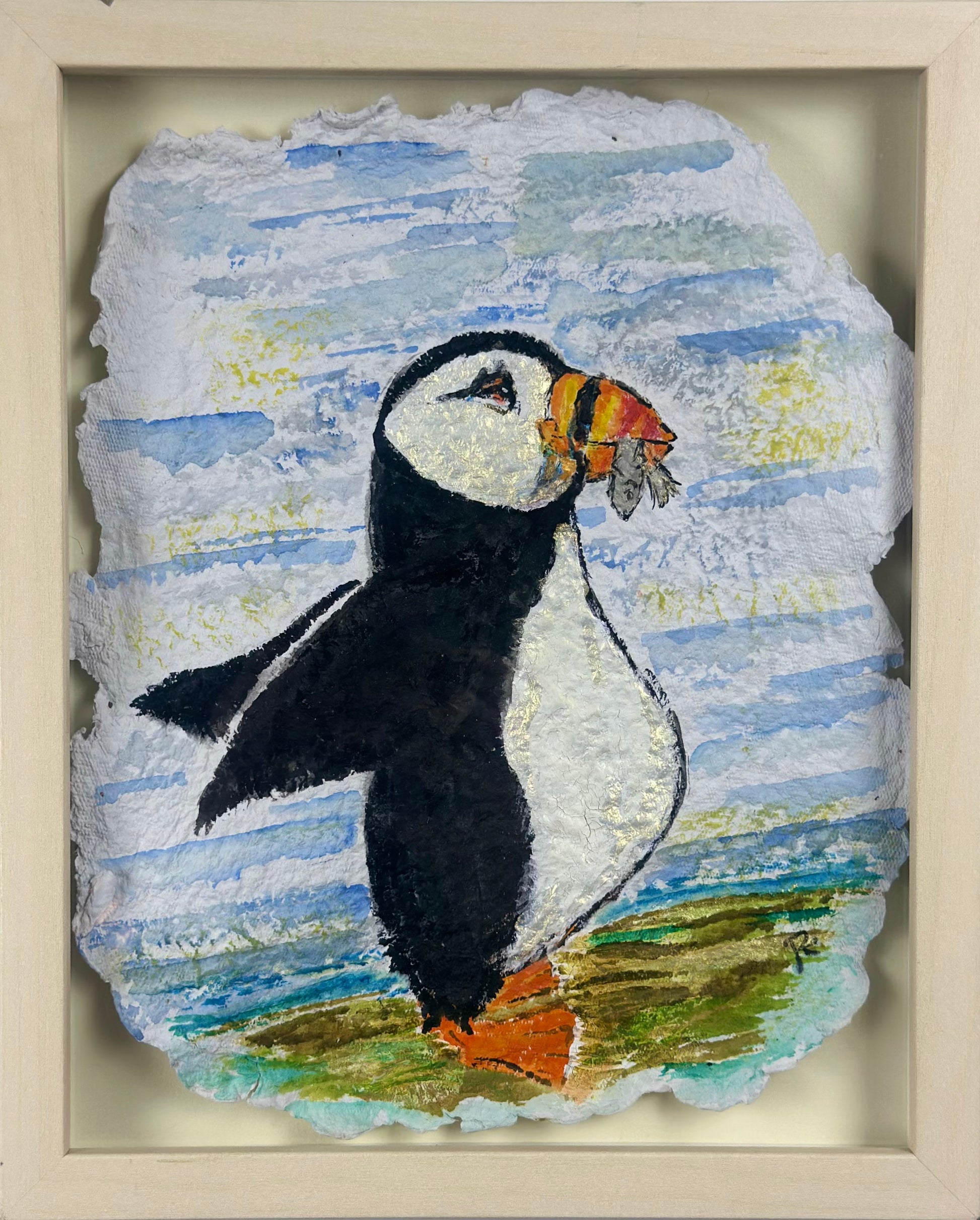I love Puffins! Hence, I created a series for this show. I have five puffin images created three different mixes of mediums. Totalling 15 unique pieces of Art! Rhonda Evans - Out for a Puffin - Watercolour At first I made watercolour using recycled art materials, cardboard, even small projects, that were discards from months of teaching at H’art Centre. If any of these five 8x10 framed unique pieces sell I will buy art supplies for my H’art students.)