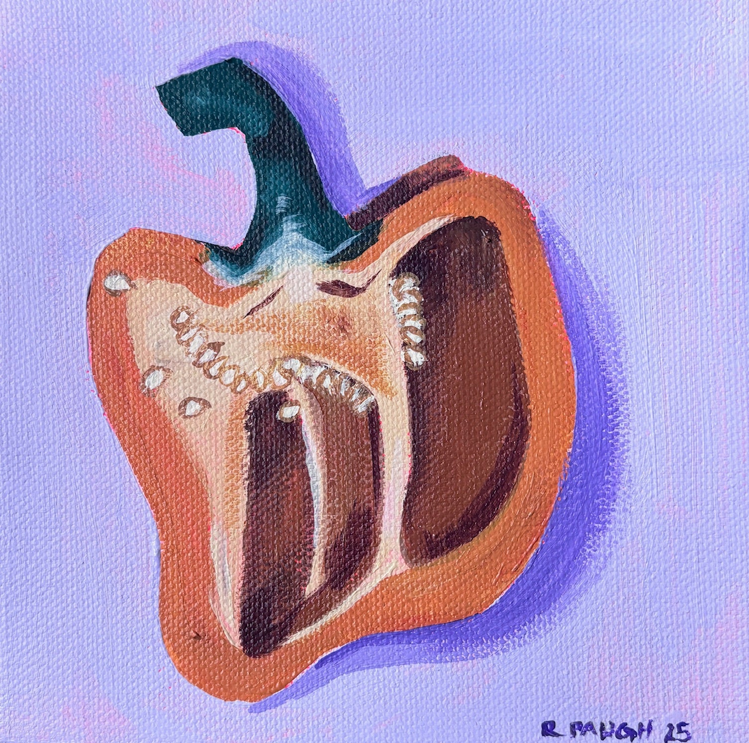 Painting of a orange pepper cut in half, insode view, on a purple background.