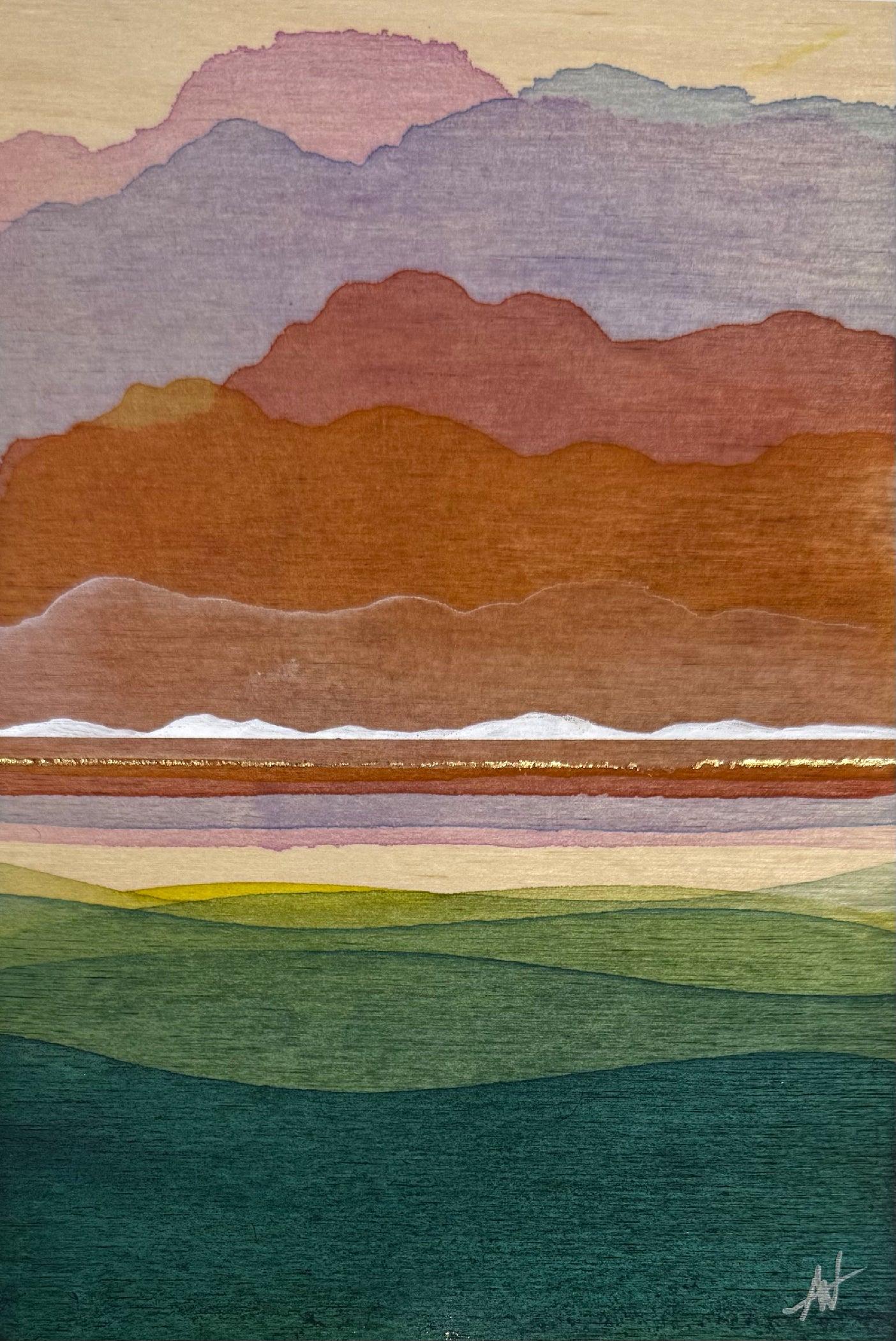 Acrylic wash and gold leaf on gallery depth birch panel.