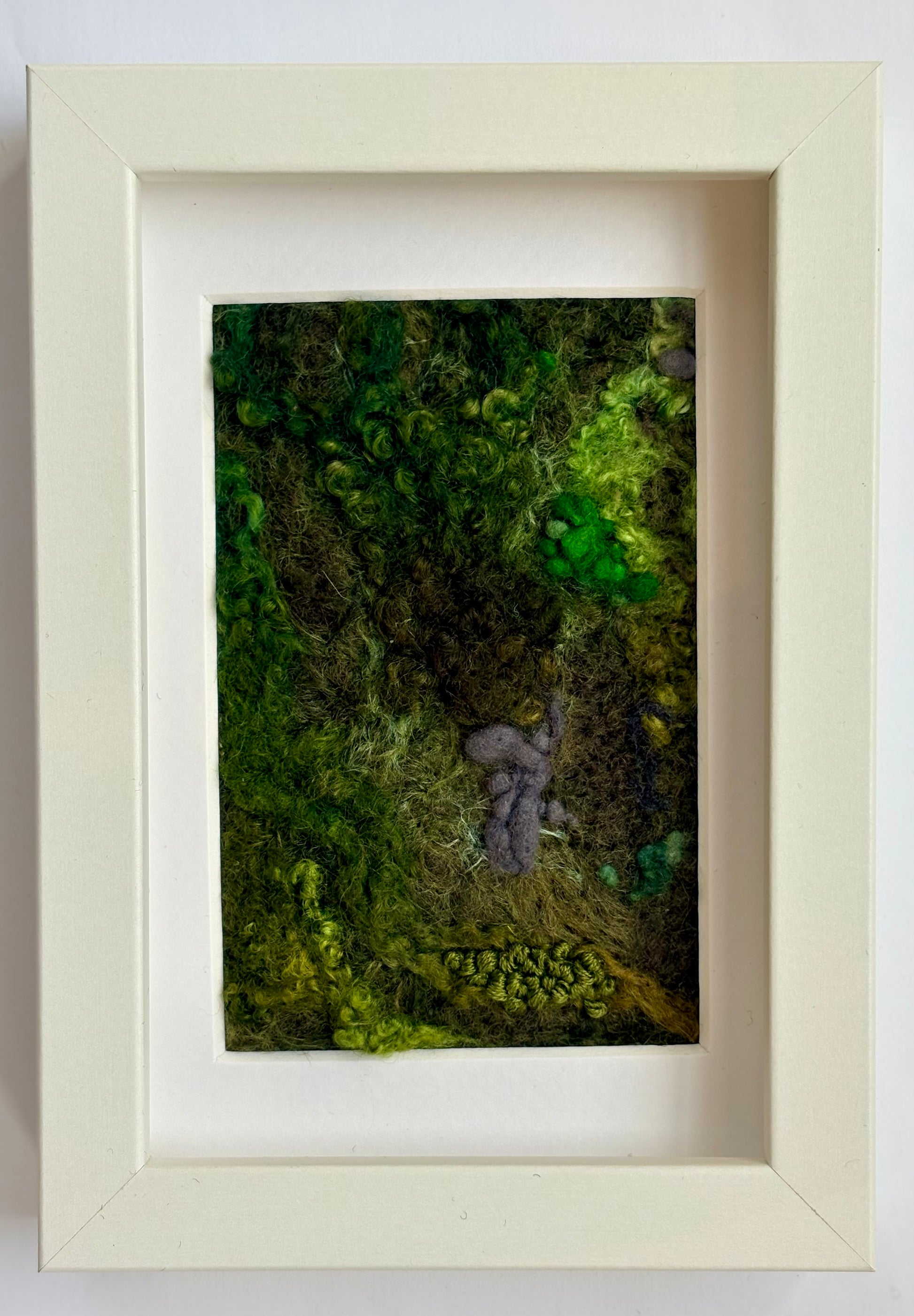 Wool and silk intertwine in mossy tones, embroidered to suggest surfaces gently surrendered to time. The work reflects the patient persistence of nature, turning structure into irregular, tender, living forms.