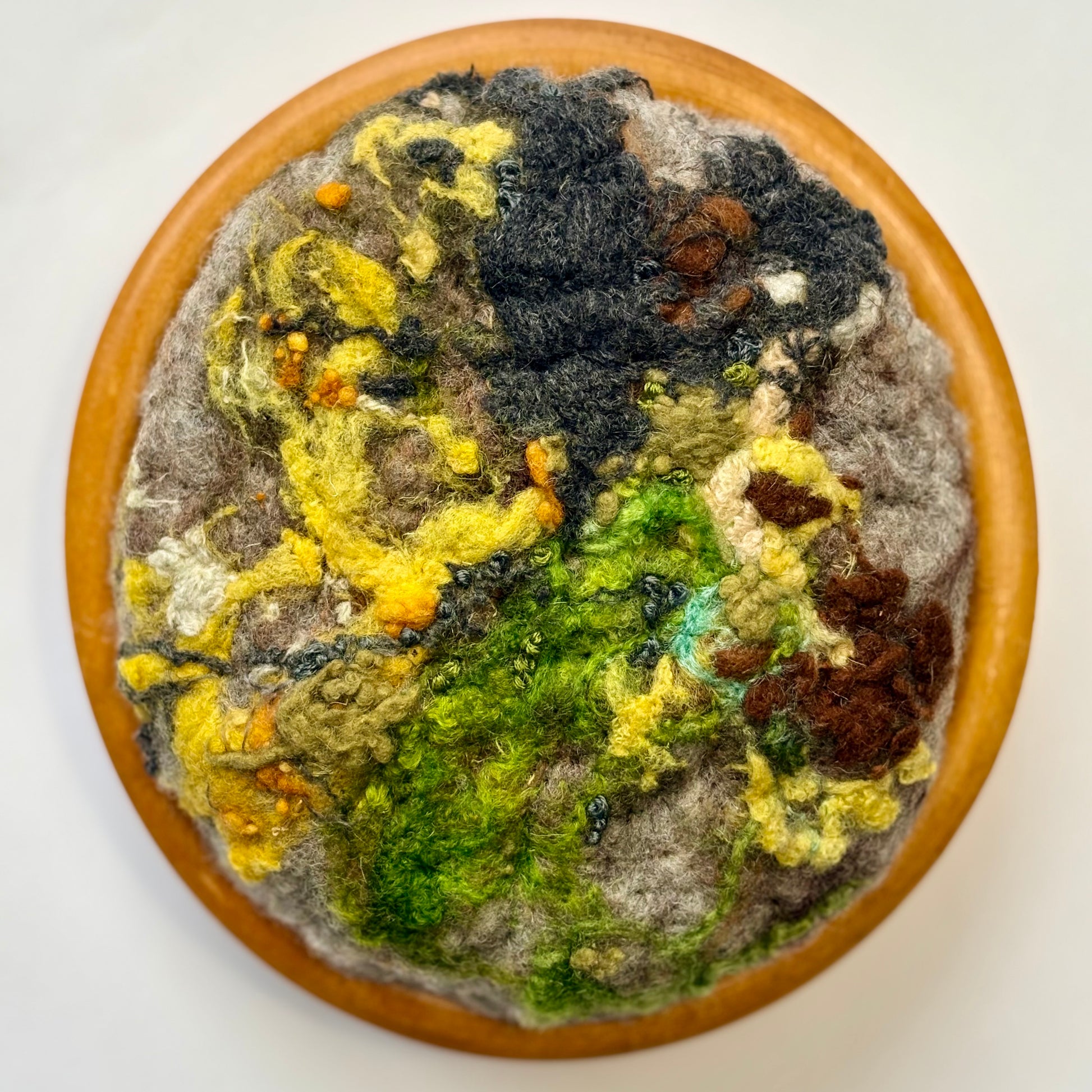 Sheep’s wool and recycled cashmere yarn are worked into a moss-like surface within a vintage wooden bowl. Subtle hand embroidery traces growth and return, echoing land slowly reclaimed through time.