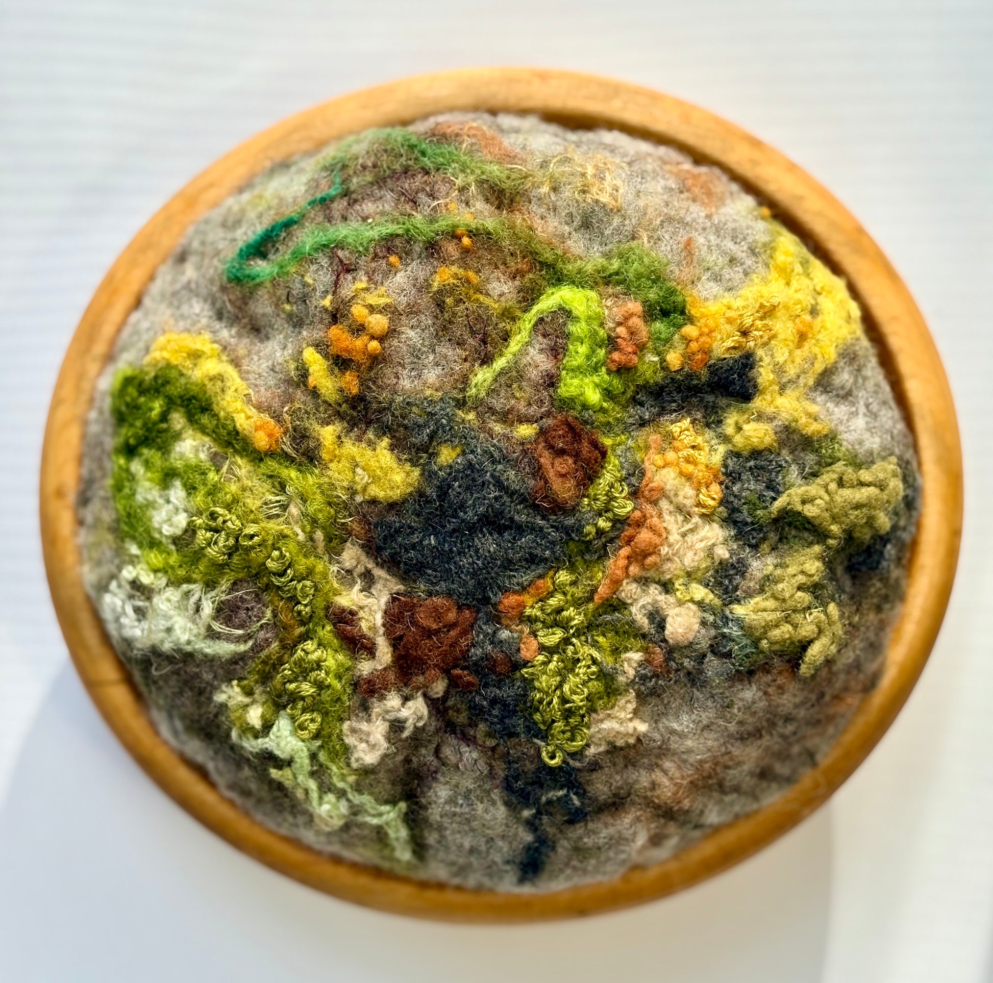 Sheep’s wool and recycled cashmere yarn nestled in vintage wood bowl are shaped into a textured surface reminiscent of forest ground and lichened stone. Embroidered elements act as subtle interruptions — evidence of time, care, and return.
