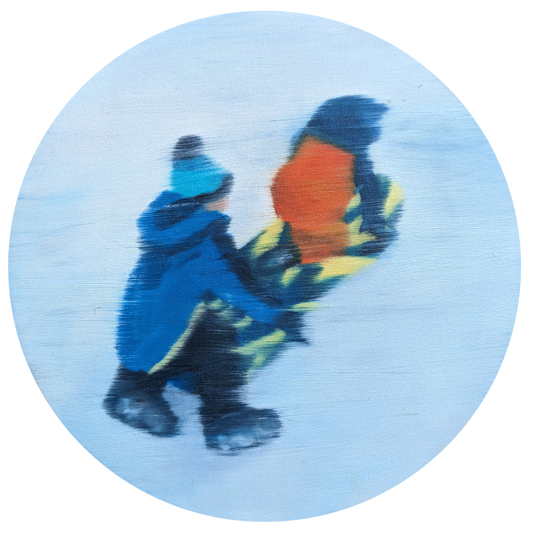 This sweet painting captures fun in the snow tobogganing with friends. This piece is ready to hang on wood Tondo.