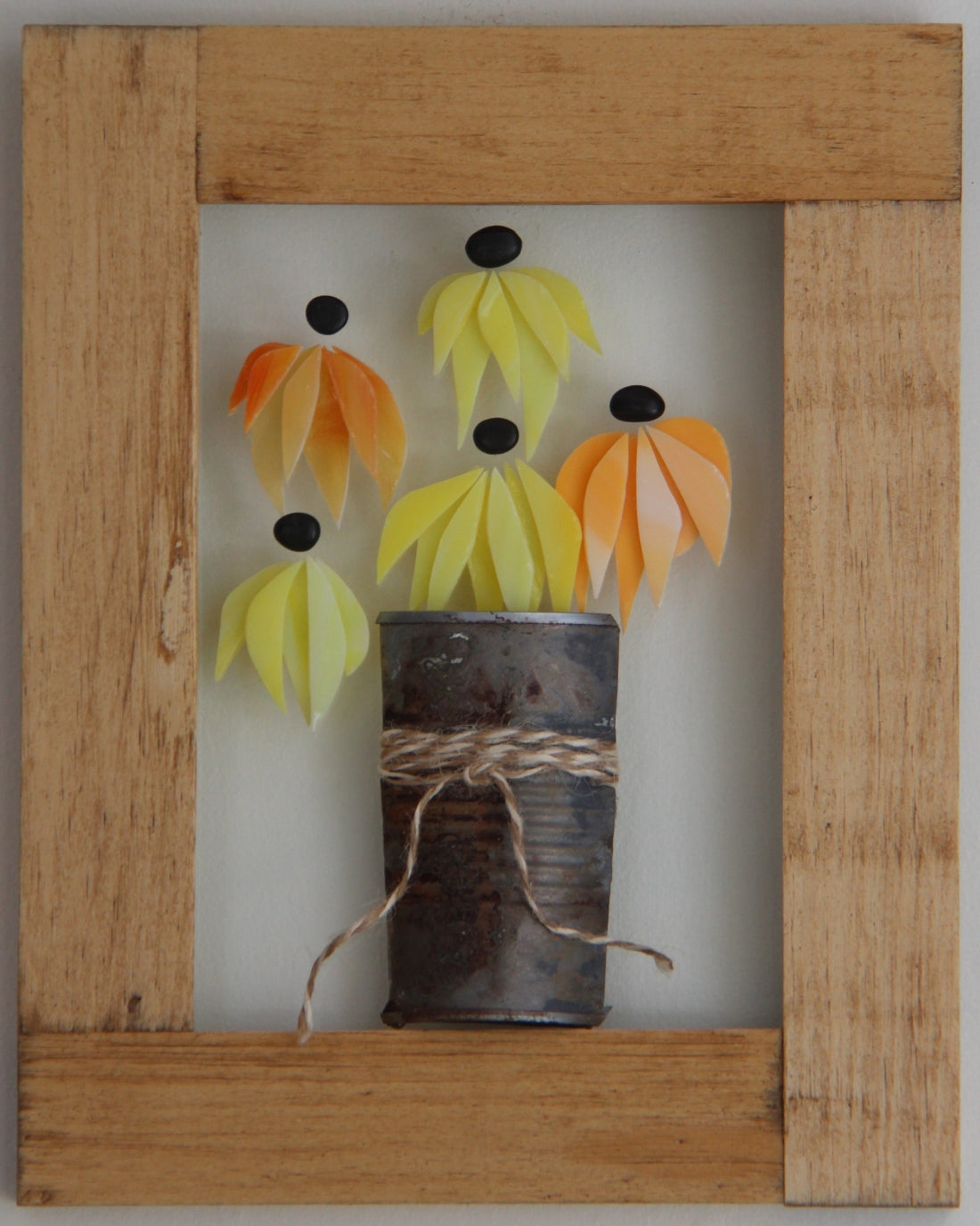 Stained glass in a pine frame & tin can.