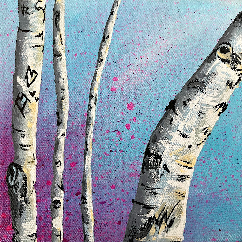 Birch trees with carved hearts on a blue background.