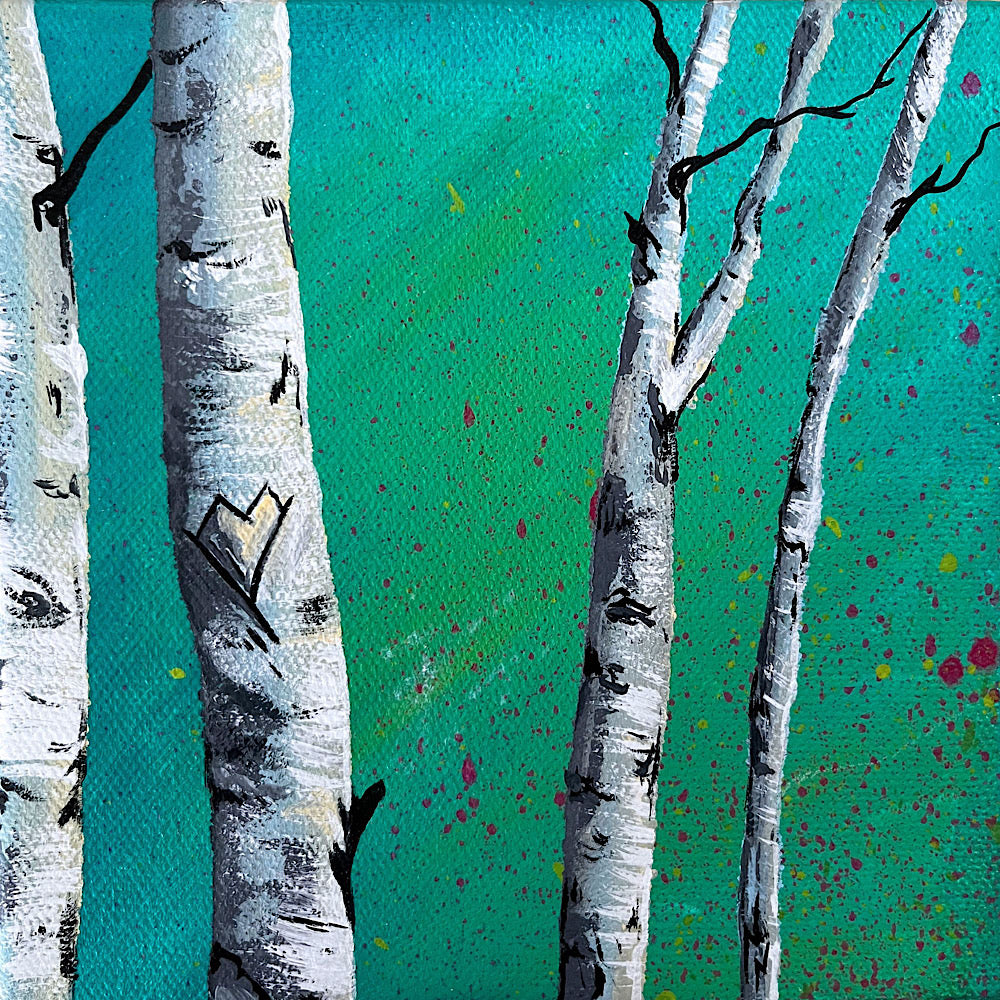 Birch trees with carved hearts on a teal background.