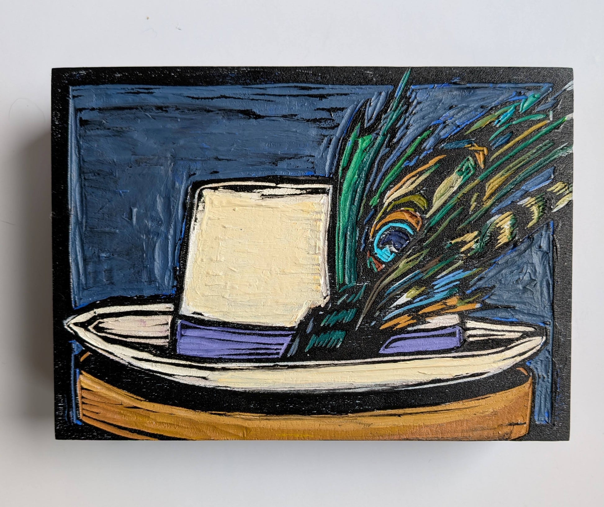 Acrylic on hand carved wooden gallery style panel, with edges painted black and a saw-tooth hanger on the back.