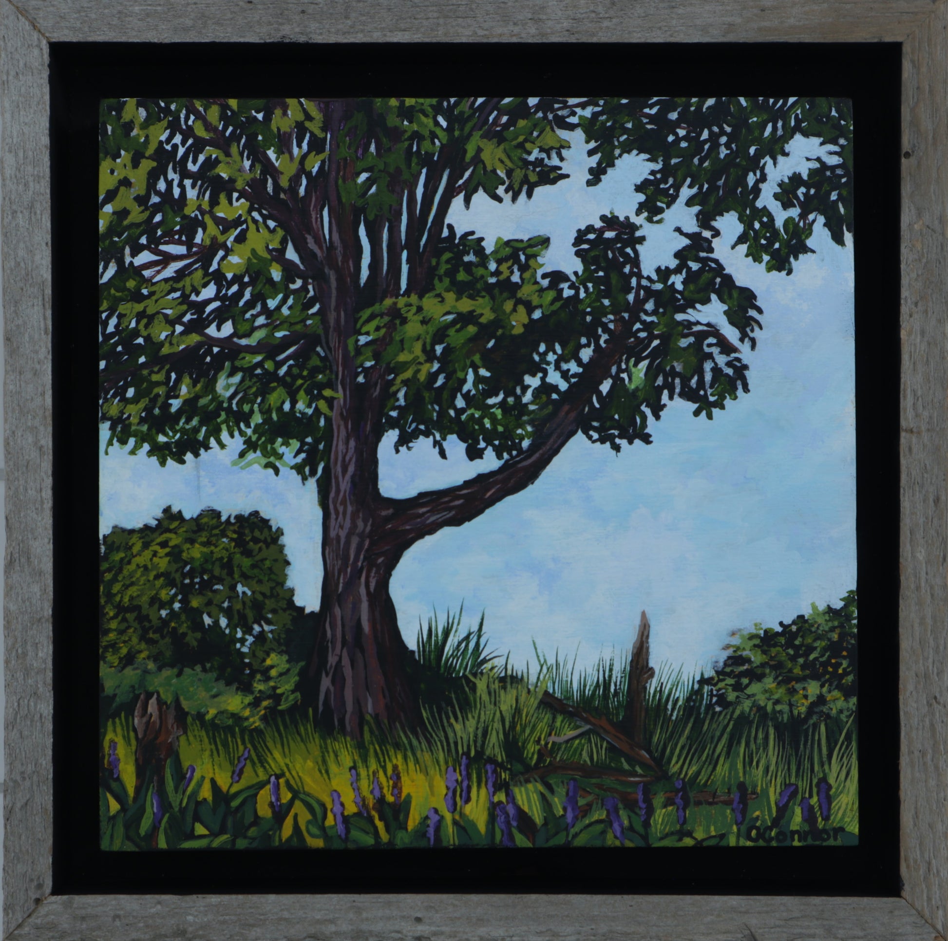 6x6 inch, framed in a reclaimed wood shadow frame; overall dimensions 7 1/2 x 7 1/2 in.