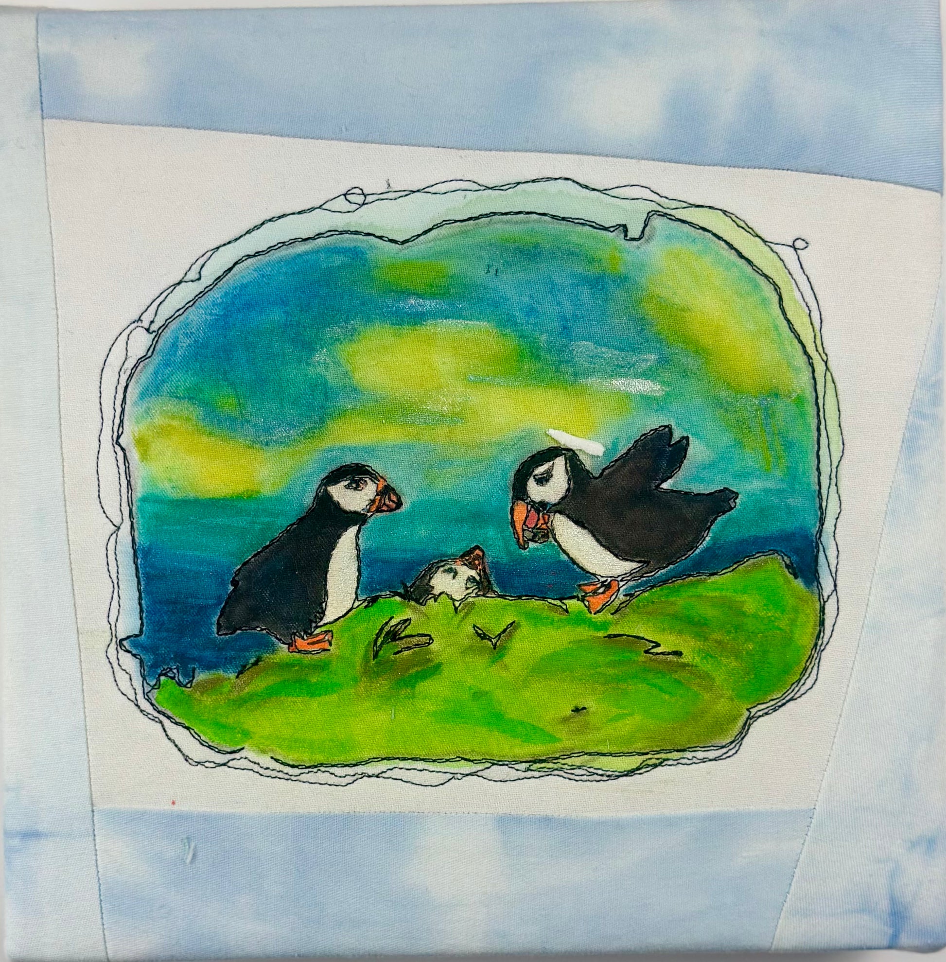 I love Puffins! Hence, I created a series for this show. I have five puffin images created three different mixes of mediums. Totalling 15 unique pieces of Art! Time to feed the Puffling - Embroidery This digitized then embroidery set image, then embellished with more stitching, was painted with dyes on cotton, then quilted together with my hand dyed fabrics! Then it is finished on a gallery depth birch panel, ready to hang!
