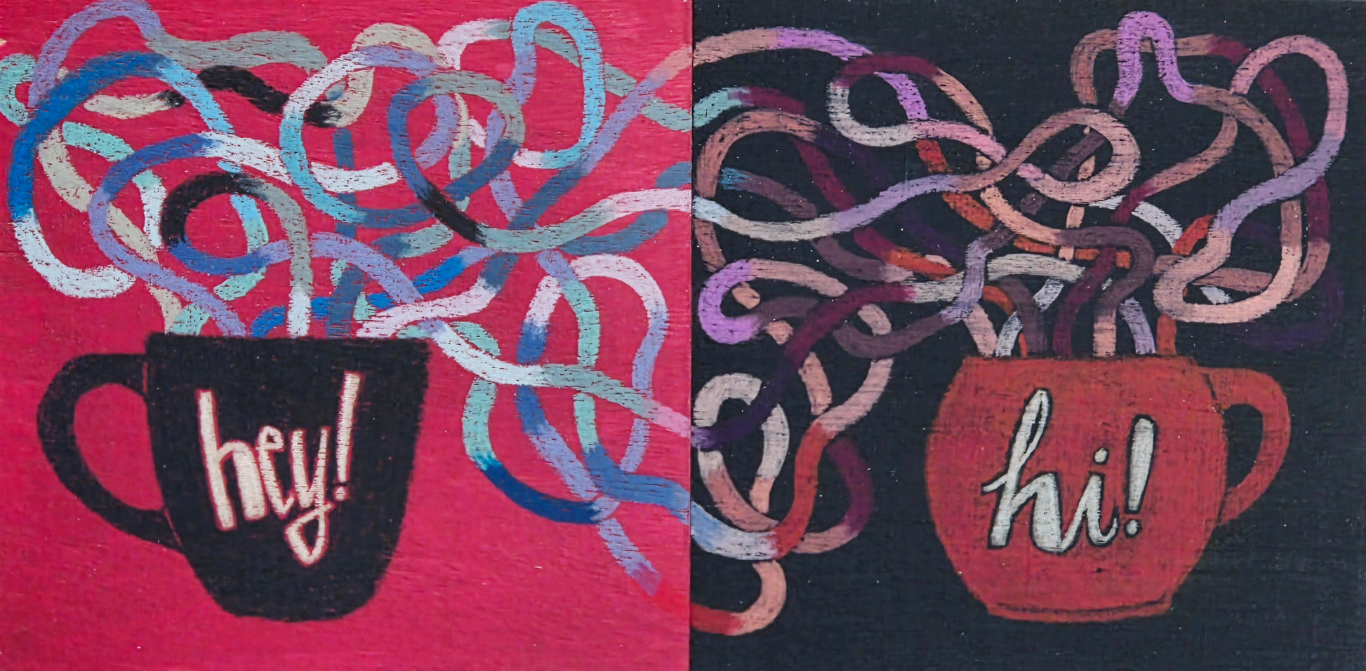 Gouache and colour pencil, painted and drawn on wood
