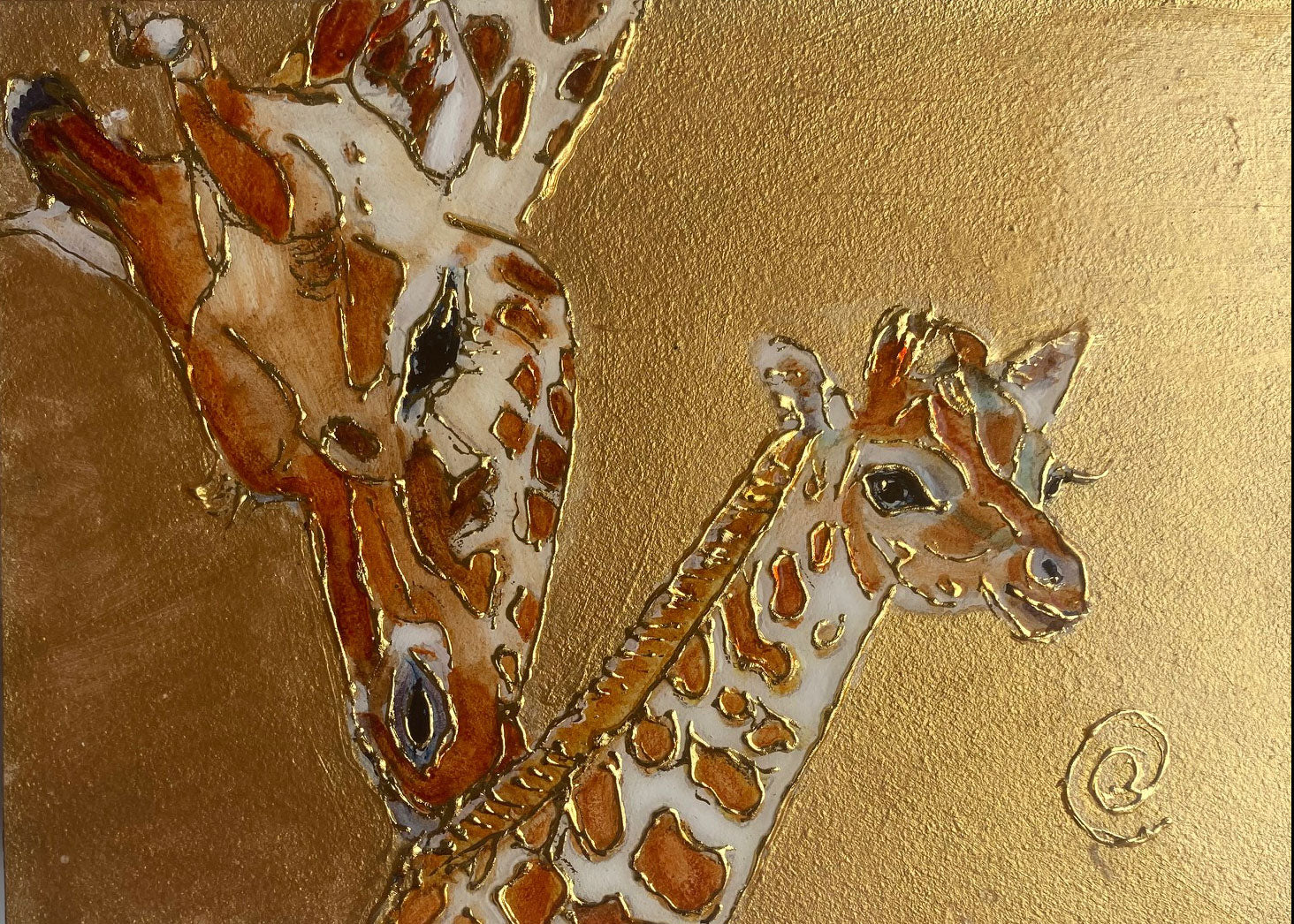 Mixed including acrylic and textured metal leaf on 1.5 inch cradled board, finished with a glossy finish and black edges.